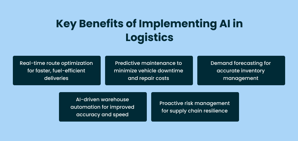 Artificial Intelligence is not just an add-on — it’s a fundamental enabler of operational excellence. Here are the core benefits businesses experience when integrating AI across logistics workflows: